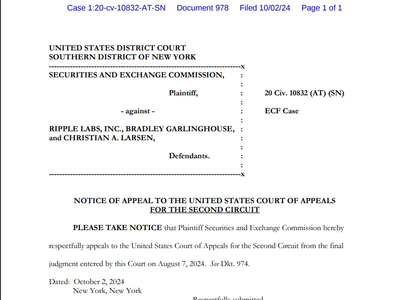 10월 2일, 증권거래위원회(SEC)는 2023년 7월에 미국 지방 판사인 아날리사 토레스가 내린 판결에 대한 항소 통지서를 제출했습니다. 토레스 판사는 판결에서 XRP의 프로그래밍 방식 판매가 증권법 위반을 구성하지 않는다고 결정했습니다. 이 발표는 수년 동안 싹트고 있던 Ripple과 SEC 간의 법적 싸움이 계속되고 있음을 의미합니다.